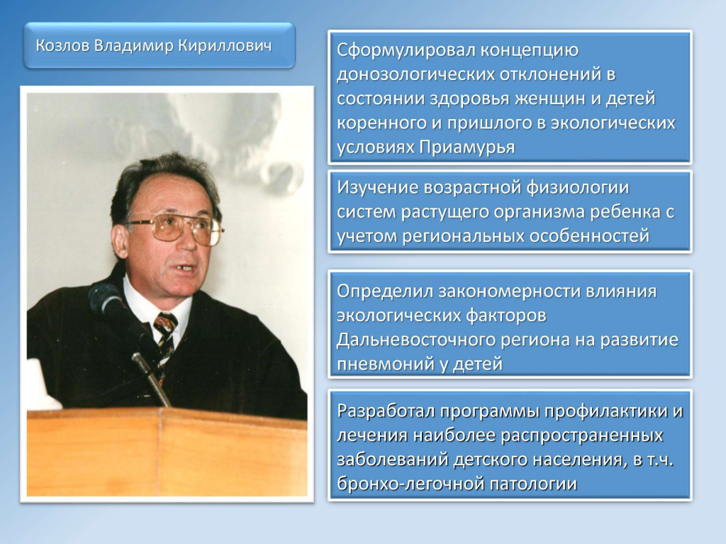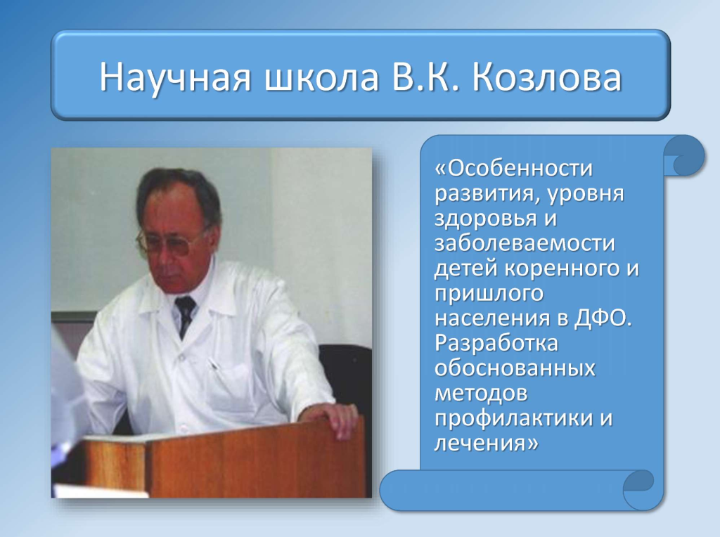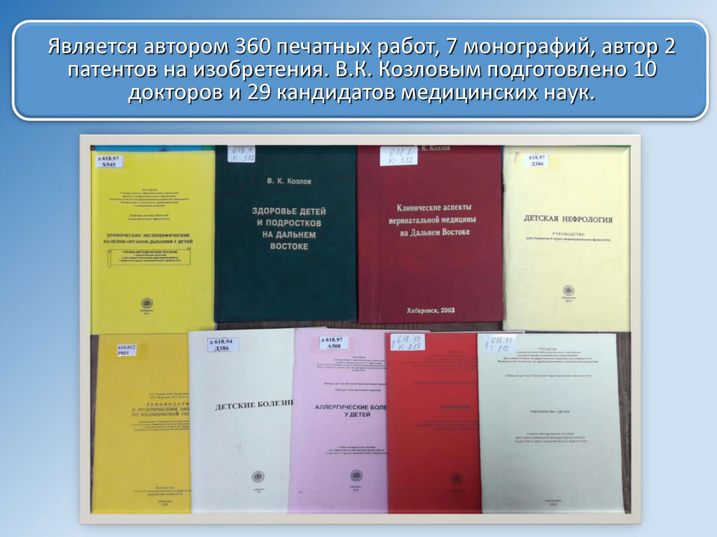 Пиотрович, профессор В.К. Таточенко. Научные работы В.К. Козлова посвящены вопросам изучения закономерности влияния экологических факторов Дальневосточного региона на развитие, клиническое течение болезней легких и почек у детей, разработке и внедрению новых, научно обоснованных методов профилактики, диагностики и лечения женских и детских заболеваний, им сформулирована концепция донозологических отклонений в состоянии здоровья женщин и детей коренного и пришлого населения в экологических условиях Приамурья. Разработаны и внедрены нормативные величины физического и полового развития, параметров иммунной и эндокринной систем подростков региона, что способствует своевременной диагностике и профилактике различных патологических состояний. В.К. Козлов является главным педиатром при представителе Министерства здравоохранения РФ по Дальневосточному федеральному округу, активно способствует внедрению научных исследований в практику здравоохранения. Является автором 360 печатных работ, 7 монографий, автор 2 патентов на изобретения. Владимиром Кирилловичем подготовлены 10 докторов и 29 кандидатов медицинских наук. Владимир Кириллович является сопредседателем общества Японо- Российского обмена опытом в педиатрии, председателем Краевого педиатрического общества, членом редакционной коллегии журнала ««Paediatrica International», членом редакционного совета журналов «Евразийский медицинский журнал», «Российский вестник перинатологии и педиатрии», «Дальневосточный медицинский журнал», «Бюллетень физиологии и патологии дыхания», членом диссертационного совета Д. 208.026.01 Дальневосточного государственного медицинского университета (г.