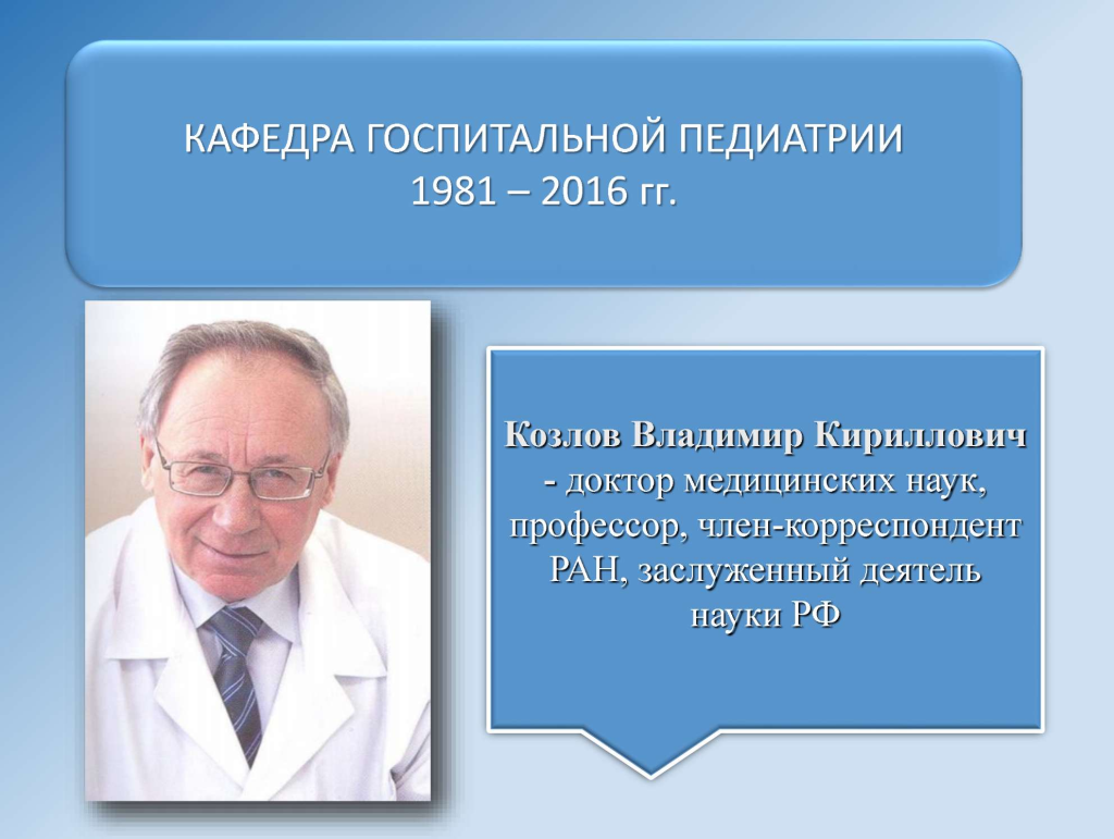 Козлов Владимир Кириллович - доктор медицинских наук, профессор, член- корреспондент РАМН, заслуженный деятель науки РФ, заведующий кафедрой госпитальной педиатрии с 1981 по 2016гг.