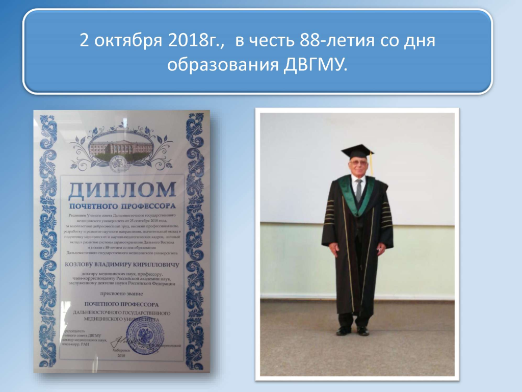 Решением Ученого совета университета от 2 октября 2018г. В.К. Козлову присвоено звание Почетного профессора ДВГМУ.