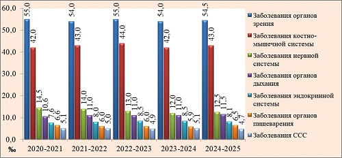 | Заболевание органов зрения | 55,0 | 54,0 | 55,0 | 54,0 | 54,5 |